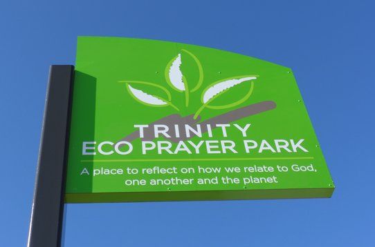 After five years with no on-site indication of the what the park is called, Trinity Eco Prayer Park now has a sign proudly proclaiming its name. Rosenbaum’s Signs made and installed the sign, which displays the stylish park logo near the corner of 4th and St. Joseph Streets. It also declares the park’s goal to be “a place to reflect on how we relate to God, one another and the planet.”